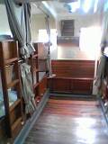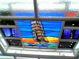 帆船には、各所に新鮮な空気を取り入れたり、 明かりを取り入れる工夫がなされていました。 左の写真は、士官サロンの天井にあったもので、 綺麗でしたよ。燦々と太陽の明かりが降り注いでいました。 士官が食事や会議をする部屋だそうで、テーブルも椅子も固定されていました。 かなり揺れたり、傾いたりするんでしょうね。 45度に傾くとどんな感じなのでしょうね。 |